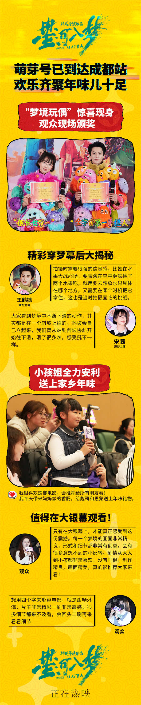 影片上映后口碑持续发酵,猫眼淘票票双平台评分达9.5分,收获各年龄段观众的一致认可。有观众表示:“视效顶尖水平,多重梦境奇观太震撼,爽感拉满,适配大银幕”;也有亲子观众表示:“带孩子看完全不无聊,既有科幻乐趣,又有正向引导,是春节亲子观影首选”。更多网友分享观影感受:“影片解锁了国产科幻新可能,探讨了AI与人性,在当下很有意义”“实景打造梦境太用心,每一处特效都很惊艳,二刷依然被震撼”。目前,电影《星河入梦》正在全国热映中,以瑰丽梦境与科幻质感,邀更多观众收获别具一格的观影体验。