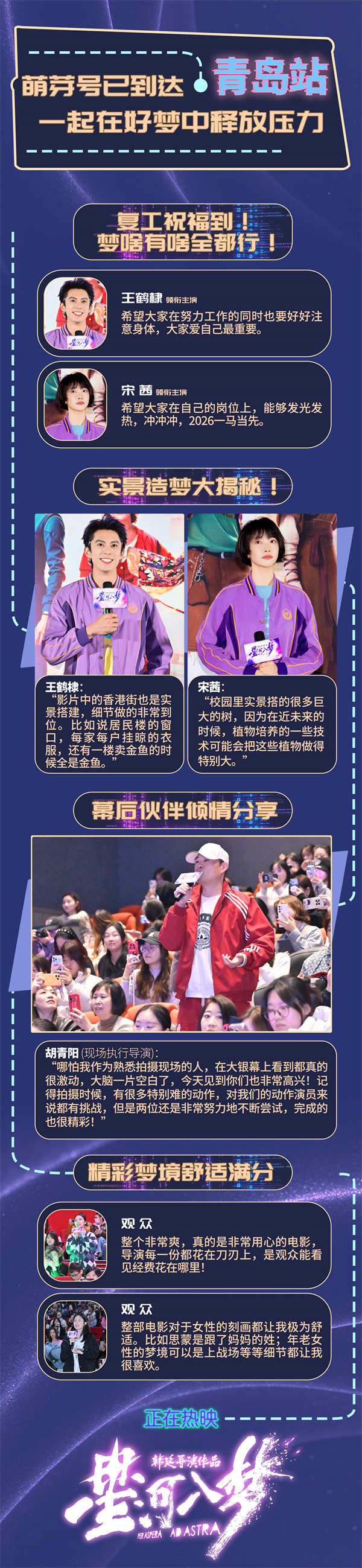 在多城路演的映后交流环节中,主创们大方分享拍摄幕后趣事,演员们以梦境戏服造型亮相,分享角色塑造心得,揭秘光怪陆离的梦境世界如何打造,更与观众热烈探讨AI科技与人类生活的现实议题,现场氛围真诚又热烈。观众们以满满热情回应,在现场与主创欢乐玩梗、大胆“搞抽象”,让现场欢笑不断。剧组也贴心准备了片中角色“小狗龙五”的形象挂件作为礼物送给现场观众。