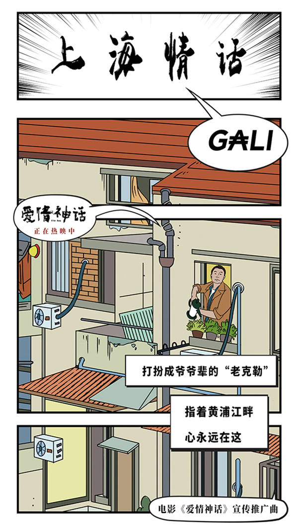 早在上海特别放映时,GALI作为受邀嘉宾和现场观众一同揭开了《爱情神话》的神秘面纱,他表示:“我是土生土长的上海人,影片中的对白、取景的地方,就是我小时候生活的地方,感觉很亲切很怀念。”在宣传推广曲中,GALI提炼出上海这座摩登之都气质的“里”与“面”,歌词韵脚从川流熙攘的淮海路一直延伸到五原路的弄堂深巷,包罗万象细节生动与“爱神”生活流风味呼应。电影从细微中定格的城市生活缩影也被收录到歌曲内容中,歌词中“鞋匠和板凳”、“梧桐树和老电影”与电影情节一一映射,而另一方面,GALI以年轻一代的视角表达了对家乡的热爱与对城市文化的理解。“海派的体面”是对多元生活态度的包容,是一种对生活的始终热忱,和对美好的不断追求。
