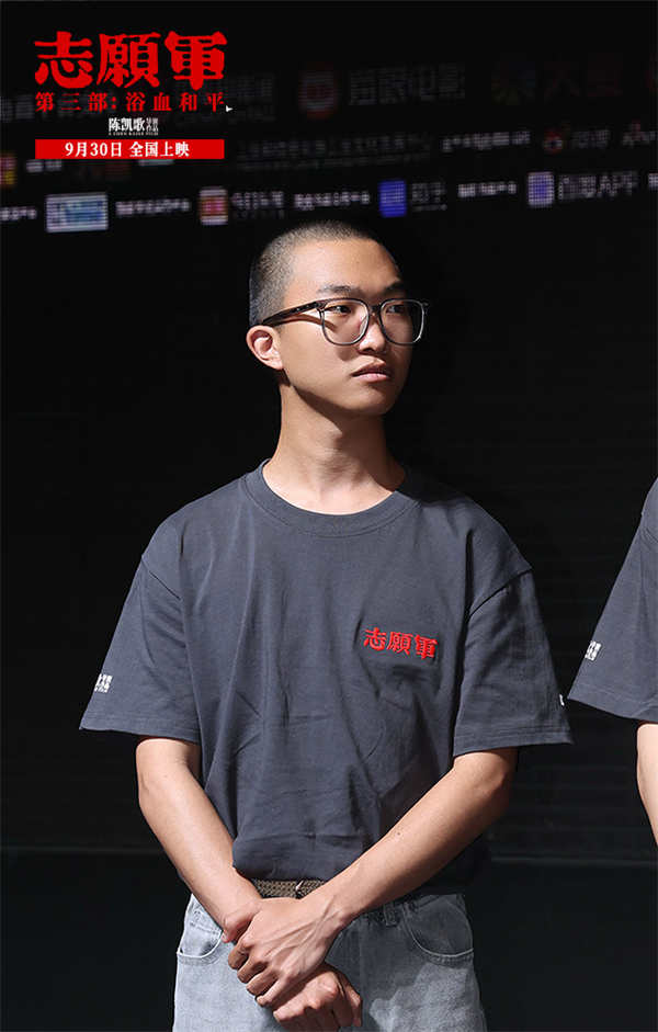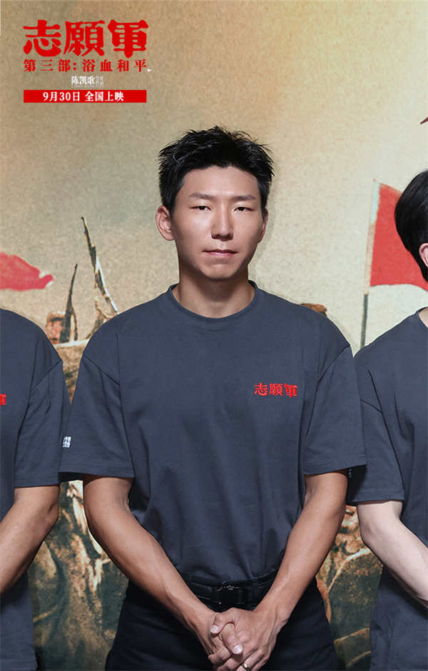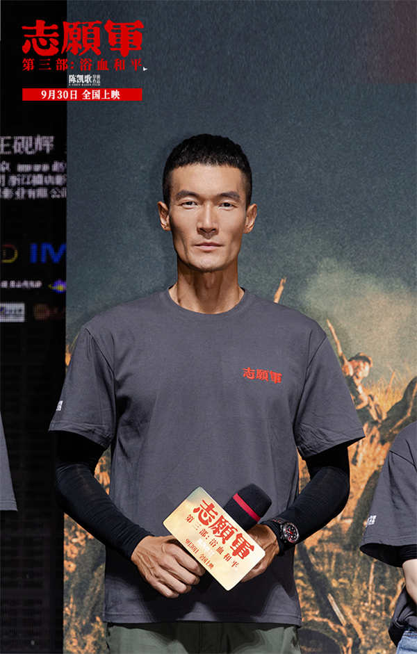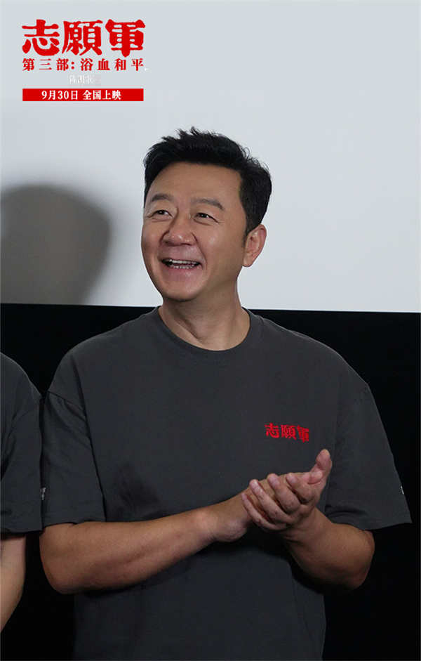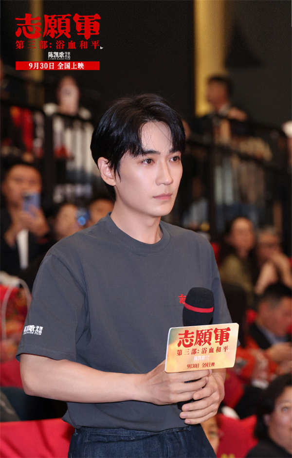 令人惊喜的是,三位前作战友代表也来到了首映现场,叶禾与王乃训分别在《志愿军:雄兵出击》中饰演志愿军第38军第112师335团1营3连的两位战士黄三宁、张尊,松骨峰上艰苦卓绝的战斗就有他们的身影;朱一龙则在《志愿军:存亡之战》中饰演志愿军第63军第188师营教导员李想,战场上的那面飘扬的红旗令人至今难忘。现场,朱一龙直言自己“绷不住”:“前面我还对自己说要冷静一点,但当整个镜头转到迎回烈士遗骸仪式的时候,我真的绷不住了,我们的祖国越来越强大,但不变的是对志愿军的思念和敬畏。李想在牺牲前其实不知道父亲是什么情况,今天我坐在这里用我的眼睛,替李想完成了一个遗憾。”两位三连的战士也深有同感,叶禾说:“我是在结尾停战欢呼的时候绷不住了,前面所有先辈们的努力在那一刻得到了实现。我记得当时拍松骨峰的时候,导演对我们说他希望革命先辈就在天上看着我们拍完这部戏,我觉得我们没有忘记三连,也没有忘记所有牺牲的战士。”王乃训坦言:“我绷不住的比较早,我是看到在孙副连长牺牲的时候身上还带着《谁是最可爱的人》那张报纸,那一瞬间我就知道,副连长没有把我们三连的人忘了,三连的精神传承到了每一位战士心中,也很荣幸今天能在这和平盛世和孙副连长再次团聚,我们俩代表三连归队!”三年之期,再度团聚,此时没有硝烟和战场,只有满满的回忆和情怀,电影中他们的遗憾,终于在电影外得以圆满。