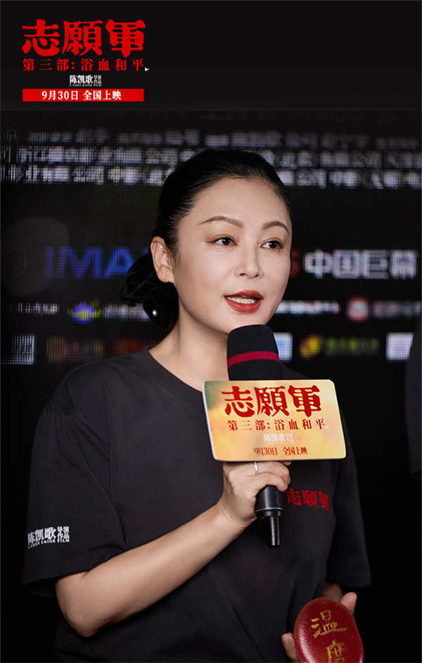 现场还来了两位特别的嘉宾,其中一位是中国人民志愿军第九兵团政治部杂技队队员何临弟,他13岁时便入朝作战,9月12日第十二批在韩中国人民志愿军烈士遗骸迎回仪式上,这位老战士流泪的一幕令无数网友动容。现场观看《志愿军:浴血和平》后,何临弟爷爷激动表示:“我非常感谢主创们能把志愿军的故事拍下来,我觉得这是给我们祖国、给我们后代留下了非常丰富的经验和财富。志愿军打出了军威!打出了国威!把我们中华民族的英雄气概打出来了!所以今天看完以后也很激动,我们今天的幸福生活是他们给的,是他们用鲜血和生命换来的,我们绝对不能忘记!永远不能忘记!”一番铿锵有力的发言振奋人心,一如70多年前志愿军做到的那样。另一位则是中国人民志愿军第12军的蒋昭瑜奶奶,现实中,蒋奶奶曾和哥哥一起赴朝作战,但哥哥最终牺牲在朝鲜,李晓的故事便有蒋奶奶的影子,影片结尾那场迎接烈士遗骸归国的戏也有她的出演。看完电影,蒋昭瑜奶奶动情表示:“我看完电影心里很不平静,我觉得导演和所有演员们给我们带来了一种精神,一种革命的精神、一种不屈的精神、一种中国人的血性!我看到亲人回家,觉得心里暖暖的,我感觉到我的兄长,连同他们的灵魂、他们的一切回到了我们的身边。”影厅中还预留了一个特别的空座位,这是留给那些入朝作战、已经牺牲的志愿军战士们的,随后主创代表为两位到场老兵和空座位献上鲜花,以此向这些“最可爱的人”致敬。