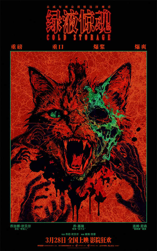 今日,惊悚科幻喜剧电影《绿液惊魂》发布一组风格独特的艺术海报。海报主体以剪影的形式呈现,营造出一种神秘又紧张的氛围。深红的底色仿佛吞噬一切,致命的绿液在不同生物的血肉中肆意蔓延。营救小队的三人抱团行动,在海报上方直面眼前的怪物,而中心的位置分别展示了腐烂半张脸的猫,以及黏着绿液的变异鹿,它们露出“死亡凝视”的目光,令人毛骨悚然。影片由“怪奇孩子王”乔·基瑞、“营救系老爹”连姆·尼森、“求生野蛮人”乔治娜·坎贝尔领衔主演,将于3月28日“引爆”大银幕。