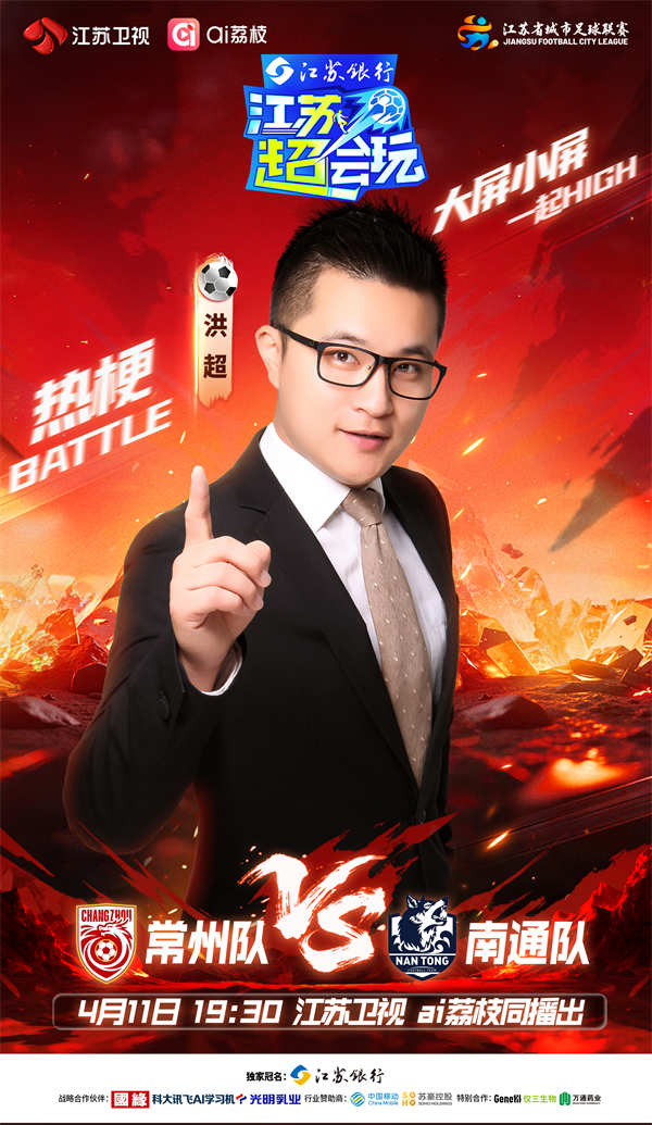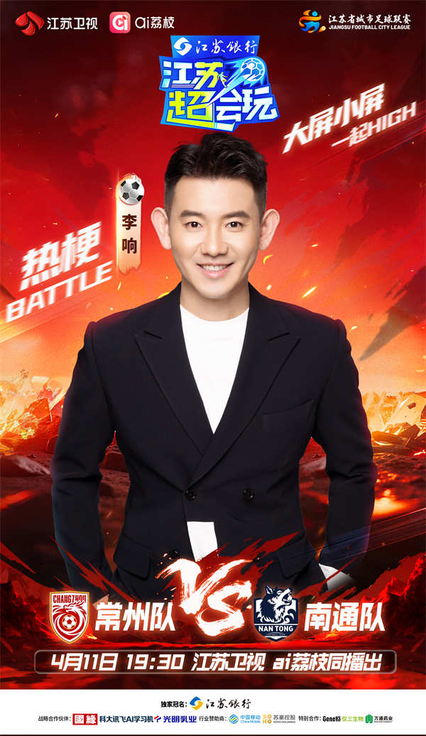 当人人都爱的“十三妹”常州队,遇上气场全开的“真南哥”南通队,2026江苏省城市足球联赛将在万众瞩目中拉开大幕。4月11日,新赛季“苏超”揭幕战将在常州奥体中心体育场打响。今晚19:30,由江苏卫视、ai荔枝跨屏联动打造的《江苏超会玩》将全程直播常州队VS南通队的比赛,同时小屏直播扬州队VS苏州队、无锡队VS镇江队,以及连云港队VS盐城队的三场比赛。主持人李响将搭档解说员洪超坐镇直播间,与大家一同见证新赛季的精彩开篇。