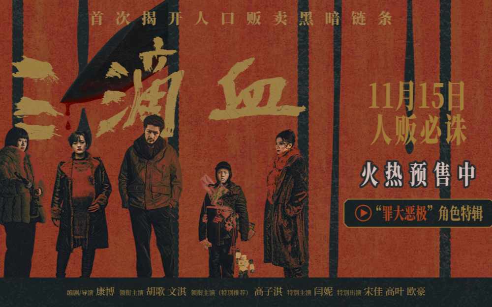 由导演康博编剧执导,胡歌、文淇、高子淇领衔主演,闫妮特别主演、宋佳、高叶、欧豪特别出演的国内首部揭秘人贩作案产业链内幕的犯罪电影《三滴血》将于11月15日全国公映。